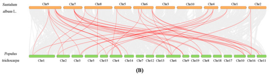 Collinearity contrast between S. album and two representative plants, poplar and Arabidopsis. (A) Collinearity analysis of S. album and Arabidopsis thaliana. (B) Collinearity analysis diagram of S. album and Populus trichocarpa. The gray lines in the background represent collinear blocks within the S. album and Arabidopsis and poplar genomes, while the red lines highlight collinear ARF gene pairs.