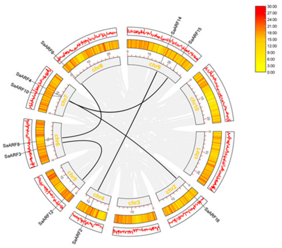Interchromosomal relationship of the ARF gene in S. album. The gray lines indicate synteny blocks in the S. album genome, and the black lines indicate synteny blocks where the ARF repeat gene pairs are located. Chromosome names are shown in the middle of each chromosome, and the unit of chromosome length is Mbp. The golden yellow circle is the heatmap of gene density, and the outermost circle is the line map of gene density.