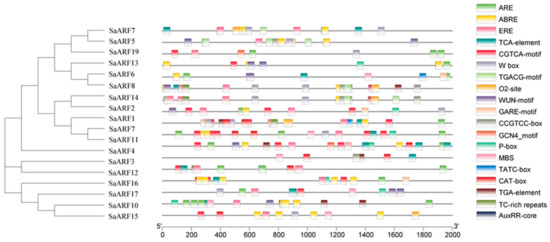 Distribution of cis-reactive elements in promoters of the SaARF gene family. There are 18 cis-reaction elements, including ARE, ABRE and ERE. ARE: anaerobic induction; ABRE: abscisic acid responsiveness; ERE: Estrogen Response Element; TCA-element: salicylic acid responsiveness; CGTCA-motif: MeJA-responsiveness; W-box: Trauma and pathogen reactivity; TGACG-motif: MeJA-responsiveness; O2-site: zein metabolism regulation; WUN-motif: wound-responsive element; GARE-motif: gibberellin-responsive element; CCGTCC-box: Meristem specific activation; GCN4-motif: endosperm expression; P-box: gibberellin-responsive element; MBS: MYB binding site involved in drought-inducibility; TATC-box: gibberellin-responsiveness; CAT-box: meristem expression; TGA-element: auxin-responsive element; TC-rich repeats: defense and stress responsiveness; AuxRR-core: auxin responsiveness (Table S4).