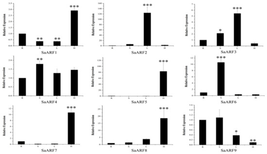 Expression analysis of SaARF genes in response to drought stress by qRT-PCR. Drought for 0 d, 3 d, 9 d in a greenhouse environment. The data were presented as the mean ± SD of three separate measurements. Asterisks denote significant differences: * p < 0.05; ** p < 0.01; *** p < 0.001.