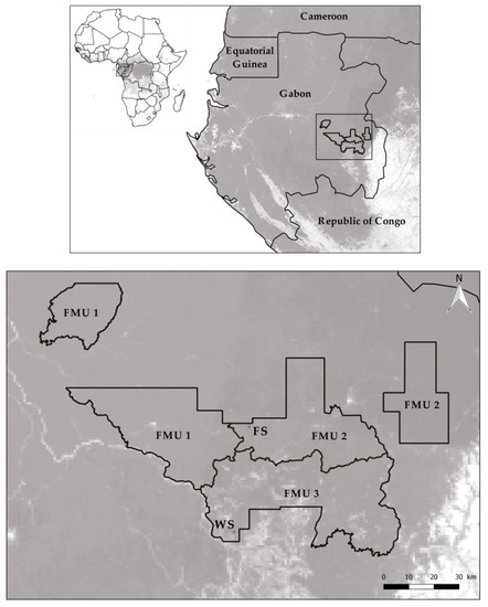 The study area is located in south-eastern Gabon, in the concession granted to the FSC-certified Precious Woods CEB Company (0°30′ S, 12°30′ E). It is composed of three forest management units (FMU 1, FMU 2 and FMU 3) covering a total area of 596,823 ha [18]. The enrichment of logging gaps was performed in FMU 2 and 3 (Figure 1). The annual rainfall is 1700 mm [19], with two distinct rainy seasons (March to May and October to December) [20], and the mean annual temperature is 25.4 °C [21]. The topography is undulating with elevation varying between 300 and 700 m [18]. The geological substrate is formed by basement Precambrian formations [22] and the soils have been identified as ferrasols [23]. Forests in the area are mostly Atlantic inland evergreen (27%, 15% and 14% of species are Fabaceae, Burseraceae and Myristicaceae, respectively) and mixed evergreen (30%, 10% and 8% of species are Fabaceae, Olacaceae and Myristicaceae, respectively) [24].