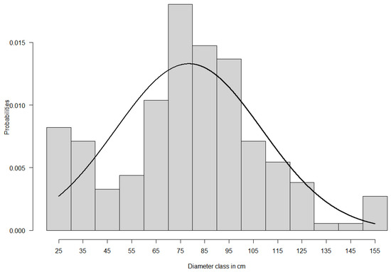 Diameter distribution of C. gabunensis stems (DBH > 20 cm) in the FMUs 2 and 3 (398,169 ha) managed by Precious Woods CEB logging company in south-eastern Gabon; (i) the x-axis shows 14 central values of the diameter classes ([20–30], [30–40], …, [150–160] cm), (ii) the y-axis represents the probabilities of the normal distribution for each diameter class.