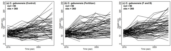 Height growth trajectory related to the installation date (between 2018 and 2020) for each seedling of C. gabunensis in logging gaps according to treatment; (a) control seedlings, (b) seedlings with fertilizer and (c) seedlings with fertilizer and biochar (F and B). Number of monitored seedlings (ind) and total number of measurements (obs) are given for each treatment. The discontinuous height trajectory for several seedlings is due to stem break events.