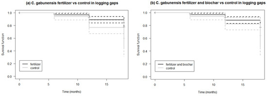 Kaplan–Meier estimates survival over time of C. gabunensis seedlings with their 95% confidence limits, as a function of treatment in logging gaps. (a) C. gabunensis seedlings with fertilizer vs. control C. gabunensis seedlings; and (b) C. gabunensis seedlings with fertilizer and charcoal vs. control C. gabunensis seedlings.