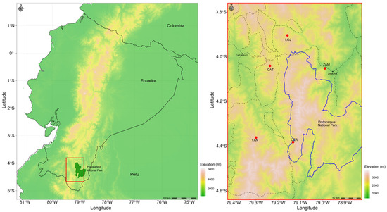 Topographic map of the study area in Ecuador with elevation displayed. (Left) location of Ocotea rotundata populations and the Podocarpus National Park. (Right) detail of the study area. Populations sampled are indicated by a red dot. Main roads are indicated by a dashed line. The blue line indicates the limit of the Podocarpus National Park. Main cities are also indicated.