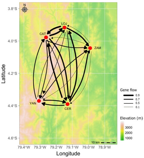 PhiPT and the gene flow (Nm) between populations were 0.104 (p < 0.001) and 1.68, respectively. Pairwise migration rates between most populations were very high (Figure 2). The highest incoming and outgoing rates of exchange were found between neighboring populations, such as YAN and CER and CAT and LOJ. High outgoing migrations were also found from CER to the remaining populations, while a lower incoming rate was recorded from the farthest populations of CAT, LOJ, and ZAM. ZAM exhibited very low outgoing migration rates to all populations, contrary to incoming rates (Figure 2).
