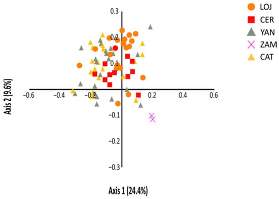 The Bayesian clustering program STRUCTURE suggested the existence of four genetic groups based on LnP(D) and ΔK values (Figure 3). A high degree of genetic admixture was found between most O. rotundata populations (Figure 3). Nevertheless, a dominant genetic cluster was found in CER that was different from the prevalent ones that characterized LOJ, YAN, and CAT. Further, ZAM was the only homogeneous genetic population. Overall, this same pattern was found in the principal coordinate analysis (PCoA), where no specific clusters were found, with the exception of ZAM (Figure 4).
