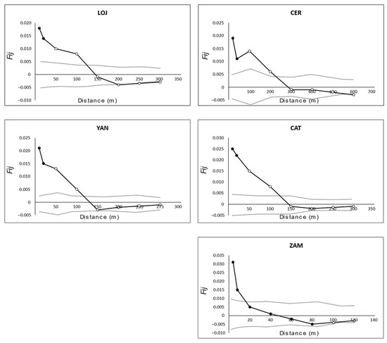 Spatial autocorrelation analyses using SPAGeDI detected significant SGS at the shortest distances in most populations of O. rotundata: 25–50 m (Figure 5). The strongest SGS was found in ZAM since it showed the highest pairwise kinship (Fij) and almost all distance classes showed significant SGS (up to 80 m; Figure 5). Further, in ZAM, a pronounced negative slope of Fij values was detected in the first distance class (up to 10 m). This was also reflected in a higher Sp statistic in this population (Sp = 0.026) than in the remaining ones (LOJ = 0.016; CER = 0.011; YAN = 0.013; CAT = 0.018).