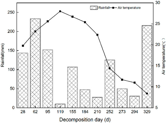 Dynamics of rainfall and temperature in the sampling site from April 2021 to February 2022. The numbers on the x-axis indicate the decomposition time in days after litterbag placement at each sampling time.