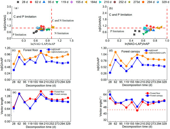 The lnβG:ln (NAG + LAP), lnβG:ln AP, and ln(NAG + LAP):lnAP ratios deviated significantly from 1, indicating microbial investments in C, N, and P are different between the forest canopy and forest floor. Both forest canopy and forest floor of lnβG:ln(NAG + LAP) ratio reached a maximum at 62 d incubation, but the lnβG:lnAP and ln(NAG + LAP):lnAP ratio reached a maximum at 184 d incubation (Figure 3). The lnβG:ln(NAG + LAP) ratio was significantly higher at both the forest canopy and forest floor compared with lnβG:lnAP, which denoted that microbes at the forest canopy and forest floor were limited by phosphorus during litter decomposition. Microbes in the forest canopy and forest floor were limited by phosphorus and carbon during litter decomposition (Figure 4).