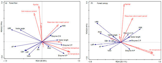 The redundancy analysis (RDA) for enzyme activity, enzyme stoichiometry, enzyme vector features, environmental factors, and litter mass-loss rate in each period in the forest canopy and forest floor. (a) Forest floor, (b) Forest canopy. βG: β-1,4-glucosidase, CBH: β-D-cellobiosidase, PER: peroxidase, PHO: polyphenol oxidase, LAP: L-leucine aminopeptidase, NAG: β-1,4-N-acetylglucosaminidase, URE: urease, AP: acid phosphatase; Enzyme C:N, lnβG:ln(NAG + LAP); Enzyme C:P, lnβG:ln AP; Enzyme N:P, ln(NAG + LAP):ln AP; C: litter carbon content, N: litter nitrogen content; P: litter phosphorus content.