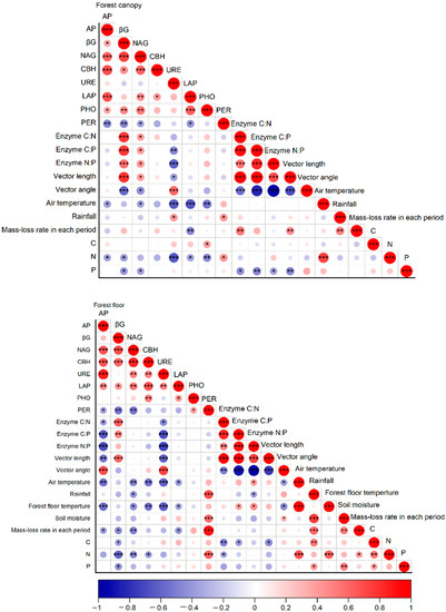 In conclusion, the enzyme activity in the decomposition process of the subtropical forest canopy is relatively low compared with the forest floor. According to enzyme stoichiometry, carbon and phosphorus both limited microbial nutrients in two habitats. Furthermore, phosphorus limitation was more robust in the forest canopy, while carbon limitation was lower. Air temperature dominated the changes in enzyme activities. The observations here will provide a new in-depth understanding of litter decomposition and enzyme activities in subtropical forest ecosystems.