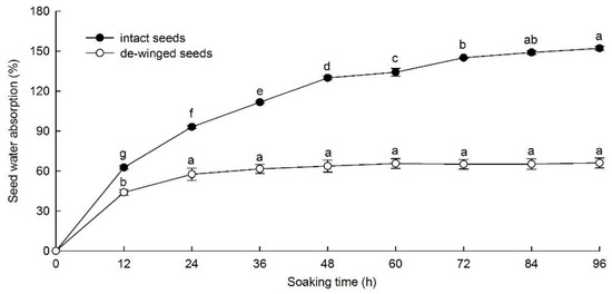 Water absorption (mean ± standard error) of intact and de-winged F. rhynchophylla seeds from 0 to 96 h. Different lowercase letters indicate significant differences between different soaking time for the same treatment showed by Duncan multiple comparison (p < 0.05).