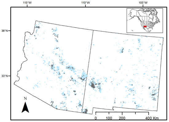 Our study area included the states of Arizona and New Mexico in the U.S. Southwest (Figure 1). This region ranges from approximately 20 to 4010 m in elevation, and vegetation ranges from desert at low elevations to spruce-fir forests and even tundra at the highest elevations. Other common vegetation types across the elevation gradient include grasslands, pinyon and juniper woodlands, ponderosa pine forests, and aspen-mixed conifer forests [29]. Annual precipitation ranges from 10 cm to 100 cm while mean annual temperature ranges from ~5 to 25 °C depending on elevation and location within the region [30].