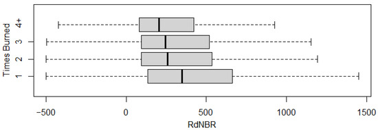 RdNBR values at points that burned 1, 2, 3, and four or more times. Shown are values for all points regardless of vegetation type. As the number of times burned increases there is a significant decrease in burn severity (Kruskal–Wallis p < 0.001, adjusted Dunn p < 0.001 for all pairs).