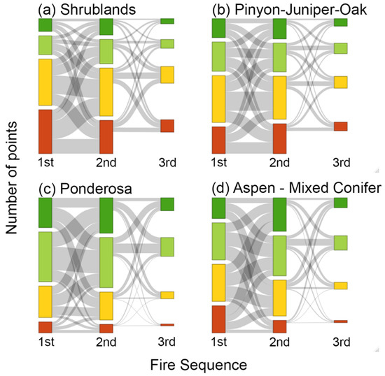 Points that fell into two or more fire perimeters (approximately one third of all points), showing unburned (dark green), low (light green), moderate (yellow), and high (red) severity in the first, second, and third fires in (a) shrublands, (b) pinyon-juniper-oak, (c) ponderosa pine, and (d) mixed-conifer-aspen. The vertical height of each colored box is proportional to the number of points in each category. The number of points is fewer in the third column within each panel because fewer points fell into three or more fires. Shrublands had the highest proportion of high-severity fire in first, second, and third fires, while ponderosa pine-dominated areas had the highest proportion of unburned and low-severity fire.