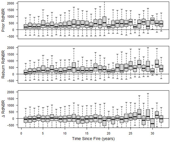 A limitation of this study is that remote sensing may not be the best tool to understand fire severity in reburns. RdNBR is calculated from satellite images as a measure of ecological change due to fire. Although it represents a fairly accurate picture of change after initial fire in multiple vegetation types [35], to our knowledge it has not been robustly tested in reburns across regions, vegetation types, and severity classes. For example, high mortality of regenerating tree seedlings could occur in a reburn that appears to have low severity in satellite images. On the other hand, a high-severity reburn as measured from satellite imagery could result in little ecological change in places with resprouting shrubs, for example. Despite these reasons to use caution in interpreting our results, it is interesting that we saw clear differences in reburn severity among ecosystems, suggesting that there are ecologically meaningful differences in remotely sensed reburn patterns among vegetation types. It would be valuable for future work to verify our findings through field measurements of reburn severity across vegetation types.