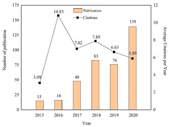 Since the 2015 Sustainable Development Goals were proposed, the number of annual publications on SDGs related to forests and forestry has been rising. Since the publication time of a paper affects the number of citations, the average number of citations cited per year was used to eliminate the influence caused by the different publication times. As shown in Figure 4, the highest number of citations was 10.83 in 2016, and the lowest value was 3.09 in 2015. The average annual citation number between 2017 and 2019 was between 6 and 8; in 2020, the number fell to 5.89. It can be seen from Figure 4 that the attention paid to this area of research, in general, is increasing year by year.