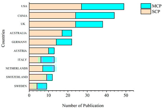 Top 10 corresponding authors’ nationalities regarding the research of SDGs related to forests and forestry. SCP indicates a single-country publication, and MCP indicates a multiple-country publication.
