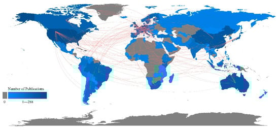 Figure 6 shows the number of articles published in each country and the level of cooperation between countries. The darker the blue color is, the more articles are published. The red line represents cooperation; the denser this line is, the closer the cooperation was. In the field of SDG-related forest and forestry international collaboration, the USA has carried out frequent cooperation with China, Australia, Canada, the UK, Germany, and the Netherlands. In addition, the European countries of the UK, France, Germany, Austria, and the Netherlands have cooperated frequently.