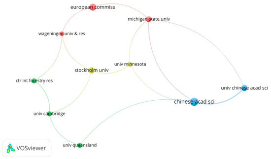 The institution with the largest number of studies on SDG-related forest and forestry topics during 2015–2020 was the Chinese Academy of Sciences (n = 21), followed by the Joint Research Centre of the European Commission (n = 14), Stockholm University (n = 12), the University of the Chinese Academy of Sciences (n = 11), Michigan State University (n = 10), the Center for International Forestry Research (n = 7), the University of Cambridge (n = 7), the University of Queensland (n = 7), and the University of Minnesota (n = 6) (Table 3). Figure 7 shows the cooperation relationships among the top 10 institutions with the highest number of publications.