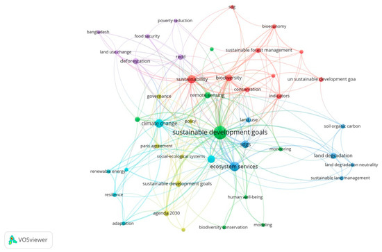 Publications with keywords in the green cluster were mainly related to remote sensing and included “human well-being,” “machine learning,” “modeling,” “monitoring,” “protected areas,” “remote sensing,” and “biodiversity conservation.” The techniques to monitor the SDG-related indicators are an indispensable step to achieving SDG. The studies in this cluster explore how to combine remote sensing to effectively monitor SDG-related indicators, such as land-use change, forest area, species distribution, forest carbon stocks, etc. [56,57].