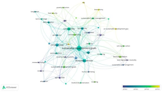 In Figure 9, the average publication years of all keywords are identified by color. Among them, yellow represents more recent keywords, indicating that these keywords have become hot topics in the research into forestry and SDGs in recent years. In contrast, the purple words are slightly less popular. Green indicates that the average publication year of the keyword is in the middle and that the corresponding keyword has thus always been a key point of research in this field.