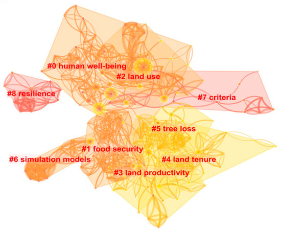 The co-citation reference collection results were clustered into nine classes using the log-likelihood ratio (LLR) algorithm (Figure 10). The quality of the cluster structure was measured using the modularity (Q) and silhouette values. Q values of greater than 0.3 and silhouette coefficients of greater than 0.5 indicated reasonable data clustering (Chen 2006). The silhouette coefficients of the nine clusters exceeded 0.7, indicating that each of these clusters was homogeneous. The nine salient clusters were sorted by the number of members (Table S4 in the Supplementary Materials). Representative publications were identified as the documents with the greatest co-citation frequency in each cluster; these documents influence the labeling of each cluster to reveal the research frontier. The results show that the reference collection could be divided into nine categories: human well-being, food security, land use, land productivity, land tenure, tree loss, simulation models, criteria, and resilience. Human well-being shows the largest number of clusters in Figure 9, which is consistent with the core purpose of sustainable development. The conflicts between forestry and other SDGs have attracted much attention. These conflicts can cause competition for land resources and the driving of economic interests.