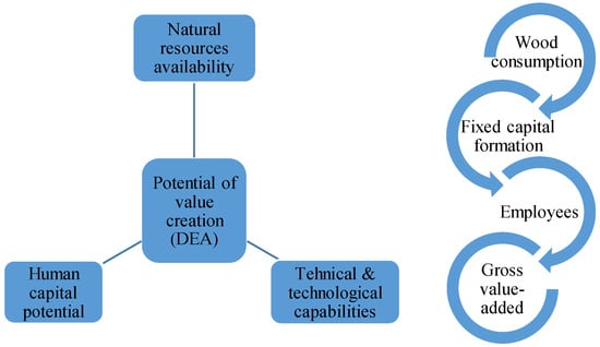 The optimal output identified through the gross value added, in the case of the “best” performers, was conditioned by a series of input factors. Following the philosophy of production functions, we considered as input variables for our benchmarking analysis the number of employees working in the forestry industry, the fixed capital affected by operations in this sector, and the natural resources used (raw wooden and intermediate materials), as reflected in Figure 1. For this purpose, we conducted a data envelopment analysis (DEA).