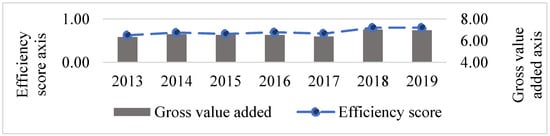 The information in Figure 3 provide us with relevant insight concerning the association between the efficiency score and the gross value added generated by forestry areas. The representation of both variables suggests a positive relationship from the association, as a higher efficiency score is related to a higher gross value added. This relationship persisted over time, but the increase in the efficiency deteriorated slightly in the period 2018–2019, mainly driven by governments’ awareness of the role of public policies and regulation for achieving targets of the SDGs, with a greater focus on SDG 15 [,,]. Therefore, awareness by the government produces visible effects on forestry, later than the adoption in 2015 of the UN Sustainable Development Goals (SDGs), showing a lower increase in efficiency starting with results reported in 2018.