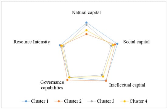 Therefore, a higher variation among countries was shown in the case of those two sub-indexes, as their coefficient of variation was slightly higher: 17.12% for the natural capital component and 19.17% for the resource intensity sub-index. Based on these results, we proceeded to a cluster analysis to group the countries included in our sample using as input criteria the five core pillars of sustainability as proposed by the Solability model. In Figure 4, we represent the mean values of each of the five sub-indexes that were part of the overall sustainability competitiveness index. In this representation, we note the slightly higher difference across the clusters on exactly the pillars placed at the basis of the calculation of this GSCI index.