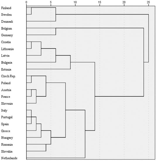 The highest spread within our sample was recorded with the natural capital sub-index, which reflects a mixture of the availability of natural resources (e.g., population, geography, climate, and biodiversity) as well as the level of depletion/degradation of those resources. Looking at Figure 5, it represents a dendrogram associated with our cluster analysis, note that countries in Northern Europe are clearly delimited in a single cluster, while the fourth cluster includes most of the countries used in our sample. These clusters are similar to the ones estimated in [,,], where the Northern European countries placed at the top of best performers in terms of sustainability performance.