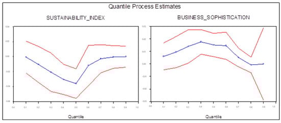 However, based on the data represented in Figure 8, we note that the negative effect of the GSCI index on the efficiency score was rather related to the average performers, better described in the 2nd quantile, whereas the 1st quantile and the 3rd quantile showed a slightly positive impact of the GCSI index on the efficiency score.