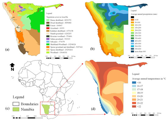 A map of the study area (Namibia) and key descriptions, (a) vegetation types, (b) precipitation variability, (c) the location of Namibia on the map of Africa, and (d) temperature variability.