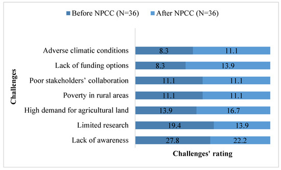 The most significant challenges were highly significant before the NPCC. However, challenges such as high demand for agricultural land (16.7%), the lack of funding options (13.9%), and adverse weather conditions (11.1%) were significant after the NPCC.
