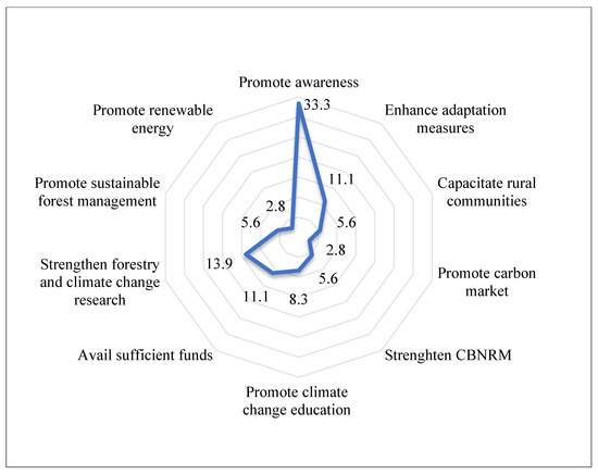 The experts expressed that promoting awareness (33.3%) was the most critical improvement needed to improve the effectiveness of the NPCC. Creating awareness is crucial in promoting adaptation actions because local knowledge is vital to help local communities cope with climate change and variability. Furthermore, awareness creation catalyzes sustainable forest ecosystem management [40].