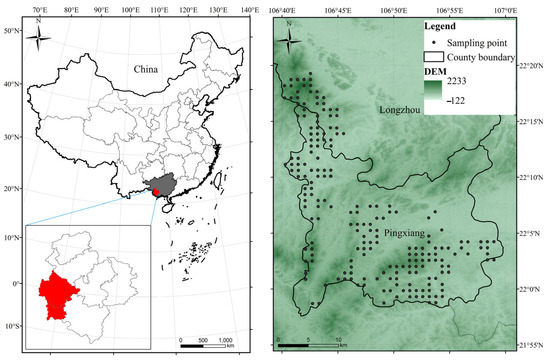 The study area was the Tropical Forestry Experimental Centre of the Chinese Academy of Forestry Science (hereinafter referred to as TFC (21°57′47″–22°19′27″ N, 106°39′50″–106°59′30″ E) in Pingxiang and Longzhou City, Guangxi Zhuang Autonomous Region. The area has a semi-humid monsoon climate and is located in the southern subtropical zone, with abundant sunshine and rainfall. The annual precipitation is 1062–1772 mm, annual evaporation is 1261–1388 mm, and the annual average temperature of 21–23 °C, with a maximum temperature of 40.3 °C and a minimum temperature of −1.5 °C. The terrain is predominantly hilly, with an average altitude of 500–800 m, and the dominant soil types are brick red loam and red soil.