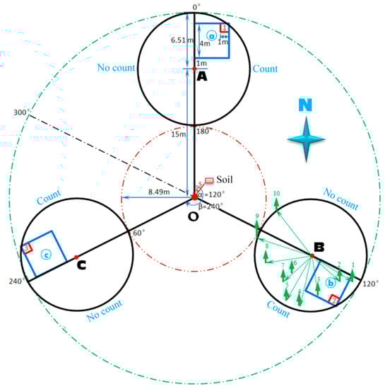 In this study, field measurement data were obtained with traditional measuring instruments in the forest inventory such as the diameter tape for DBH measurement and Ultrasonic Height Gauge VLP-5 for tree height measurement. We used 238 sample plots (Figure 1) established in 2015 at the TFC. Each circular plot had an area of 400 m2 (Figure 2) and contained three circular subsamples (A, B, C) with a radius of R = 6.51 m. Within these subsamples, 4 m × 4 m plots were used to measure young shrub (a, b, c), and 1 m × 1 m plots were used to measure young herbaceous plants (1, 2, 3). At the center of the sample plots (O), stand factors were recorded, such as elevation, slope, and slope orientation. In the three circular sample plots, the tree species, diameter at breast height, tree height, depression, origin, and stem quality of all trees with a diameter at breast height ≥5 cm were recorded. The average height, number, and cover of shrubs were recorded in the young shrub layer plots, and the number of seedlings, height, and cover of herbaceous species were recorded in the young herbaceous sample plots. Soil samples from layers O, A, and B were obtained within 8.49 m2 near the center of each tree sample plot. We carefully removed the litter layer and took three soil samples from each layer with a ring knife and mixed them together in the sampling bags. We selected 84 plantation sample plots from the 238 systematically sampled plots. Masson pine was the dominant species. The summary statistics of the plot data are listed in Table 1.