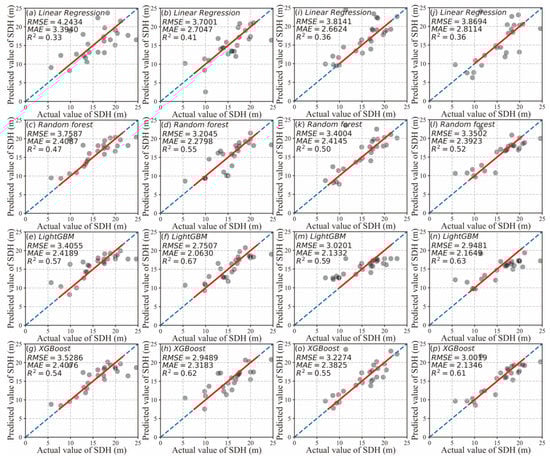 Scatterplot of the predicted and observed dominant height of the stand (SDH) obtained from linear regression, RF, XGBoost, and LightGBM for models with different variables. The dotted blue line is the 1:1 line, and the solid red line is the fitted line (only the best prediction interval line segment is retained). (a,c,e,g) are the basic models; (b,d,f,h) are the models with the climate and soil chemical variables; (i,k,m,o) are the models with the climate variables; (j,l,n,p) are the models with the soil variables.