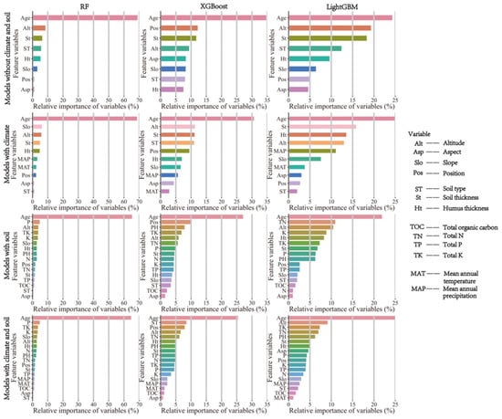 This study used the relative importance of the variables to describe the degree of influence of the characteristic variables on the dominant height of the stand. The magnitude of the parameters of each variable reflects the variable importance in a linear model. The variable importance of the machine learning algorithm models was determined using the feature importance functions in RF, XGBoost, and LightGBM. A comprehensive analysis was carried out using feature visualization and by ranking the variables according to their importance.