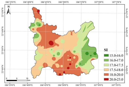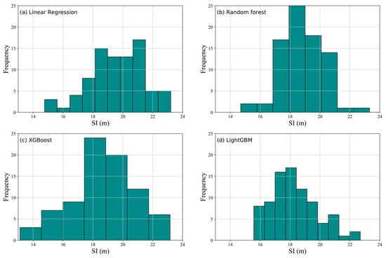 The four models with the highest prediction accuracies using climatic and soil chemical variables were selected to predict the SI based on the baseline age. The width of the bars in Figure 5 indicates the group spacing between the data. The greater the number of groups and the smaller the group spacing, the stronger the continuity of the data. Compared with the other three models, the prediction results of the LightGBM show the most uniform and near-normal distribution (Figure 5). The LightGBM model predictions for the SI show a maximum value of 22.7 m, a minimum value of 15.6 m, a mean value of 18.3 m, a median of 18.1 m, a standard deviation of 1.6 m, a difference of 0.2 m between the median and the mean, and a range of 7.1 m. The SI prediction results (Figure 5) show a normal distribution, with the largest number of sample plots with SI values between 17 and 19 and the smallest number between 21 and 23. Based on the predictions of the LightGBM model, we have made a map of the spatial distribution of the study area for SI (Figure 6). The overall spatial distribution of SI shows a trend of high in the south-eastern and north-western regions and low in the eastern and north-eastern regions.