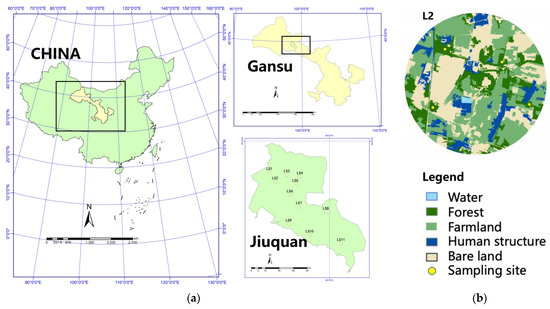 Study area in northwestern Gansu, China. (a) Eleven circular landscapes with a 500 m radius in Jiuquan. (b) Example locations of four sampling sites in landscape2 (L2).