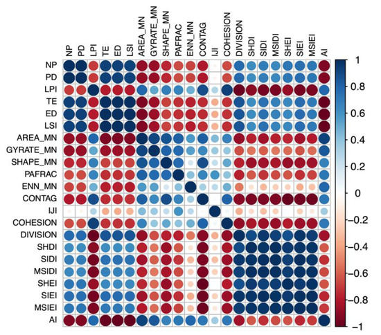 Landscape metrics were calculated in Fragstats (Version 4.2.1, Amherst, MA, USA) [36]. A total of twenty-two landscape level metrics and seventeen class level metrics were calculated and used as preliminary data to get the correlation matrix separately.