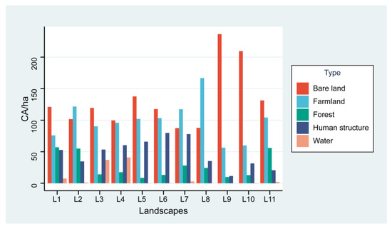 Area of each land cover in hectares. CA (total class area, ha), L1-L11 (landscape 1–landscape 11).