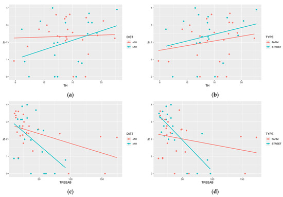 LMMs also showed that two random factors influenced the model fitness. The fitted regression lines of ly with TH and TREEAB have different slopes within different DIST and TYPE (Figure 4). Still, neither random factor passed the significance test (all random factors’ p-values > 0.05).