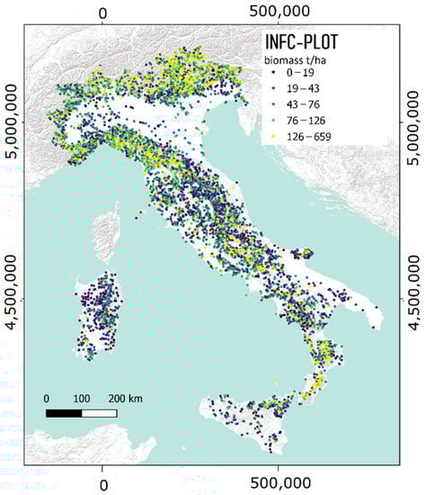 The field reference data were measured within 6782 plots surveyed in the framework of the INFC [51]. The available plot geolocation has been the target coordinate of the sampling unit. For each field plot, the biomass per hectare derived using the allometric equation developed by Tabacchi et al. [52] and the CAI (m3 ha−1) are available online via a spatial database at https://www.inventarioforestale.org/ (accessed on 1 March 2021) [53]. Figure 2 shows the spatial distribution of the plots and the biomass measured in the field. For more details about INFC, we refer to Chirici et al. [23].