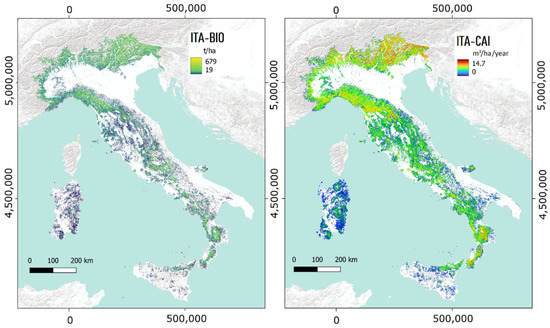The obtained biomass map (ITA-BIO) has pixels of 23 m × 23 m reporting the forest biomass in t ha−1.