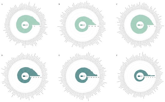 The stoichiometric ratios of C:N (A,D), C:P (B,E), and N:P (C,F) in leaf and branch of different species. The abbreviations are shown in Table 1. The axes represent the values of stoichiometric ratios.