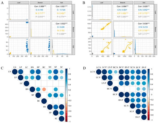 Correlations of C, N, and P stoichiometric characteristics in plant leaf, branch, and soil. Correlations between leaf, branch, and soil (A,B), C, N, and P stoichiometry (C,D). *, p < 0.05; **, p < 0.01; ***, p < 0.001.