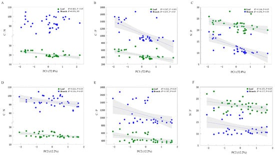 C, N, and P stoichiometric ratios related to soil properties’ PCA scores. C:N, ratio of carbon to nitrogen concentration (A,D); C:P, ratio of carbon to phosphorus concentration (B,E); N:P, ratio of nitrogen to phosphorus concentration (C,F).